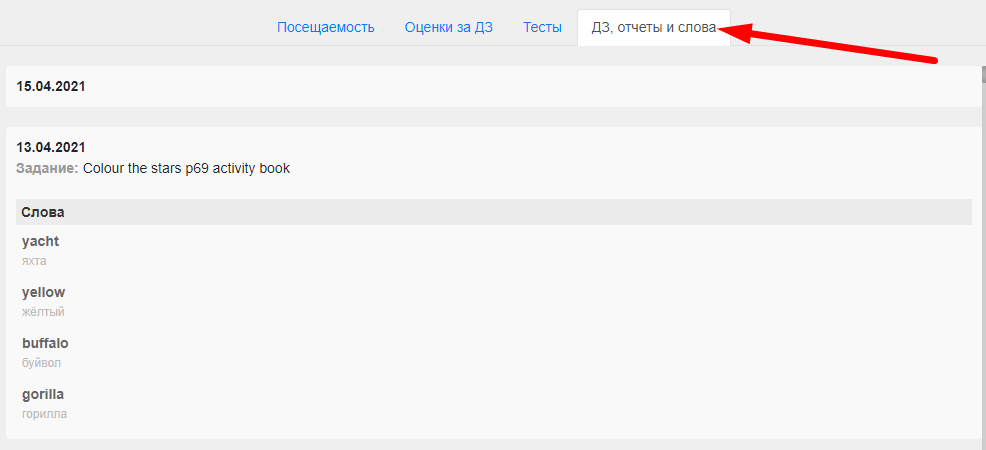 Чтобы просмотреть ДЗ, отчеты и слова, добавленные к урокам, зайдите в нужную группу и спуститесь к разделу "Посещаемость". Затем перейдите на вкладку "ДЗ, отчеты и слова". Отобразятся данные по каждому уроку.