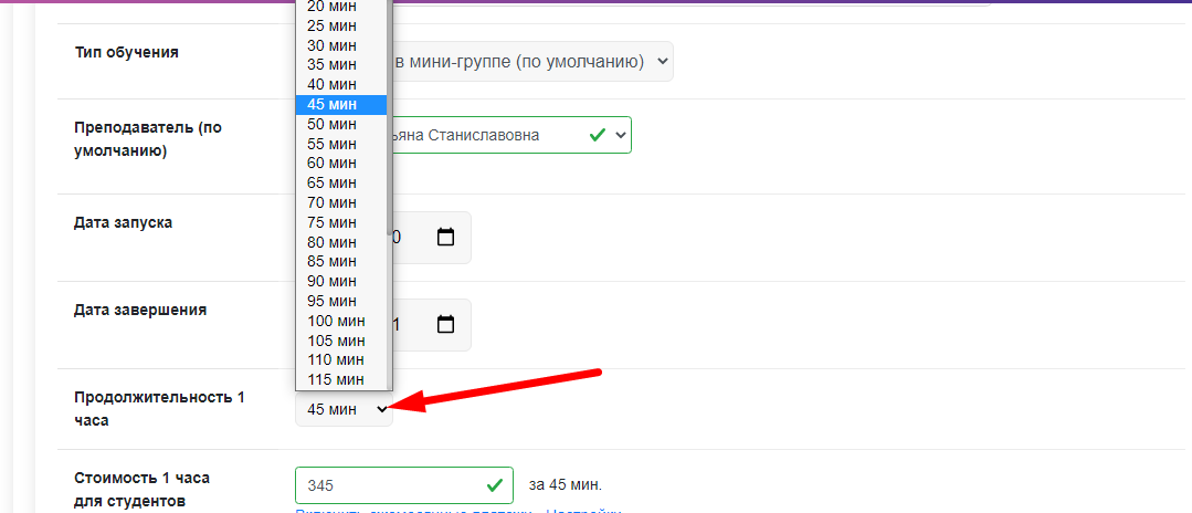 Этот параметр используется для расчета стоимости урока для студентов и начисления ставки преподавателю за урок.