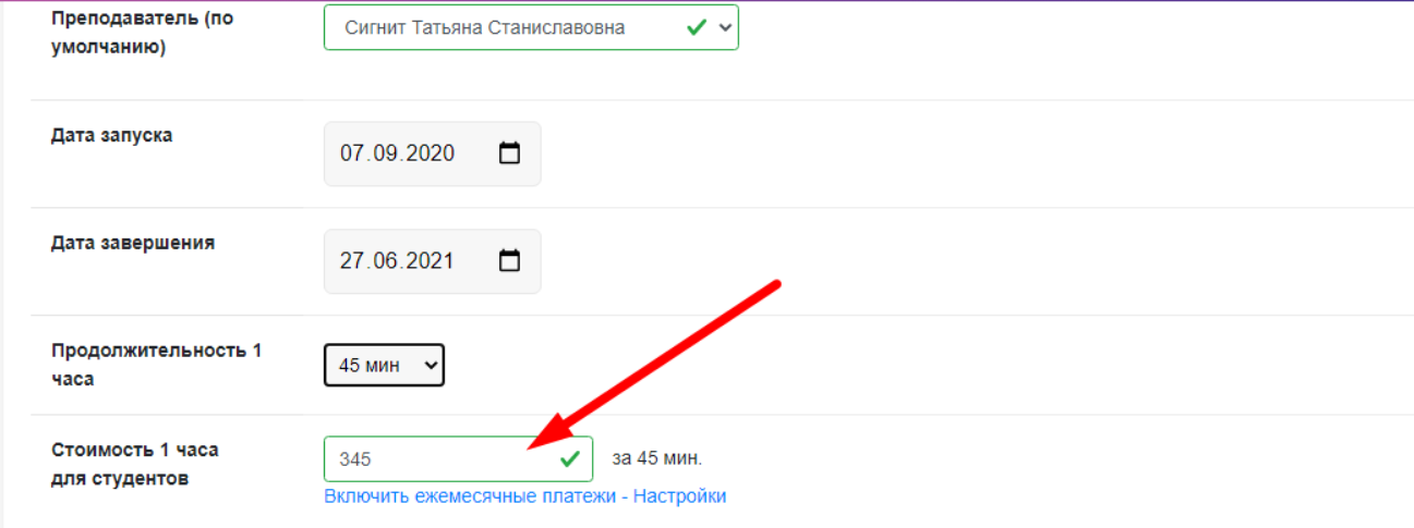 Обратите внимание, что стоимость академического часа для ученика не учитывается в расчетах стоимости урока при использовании ежемесячных платежей.
