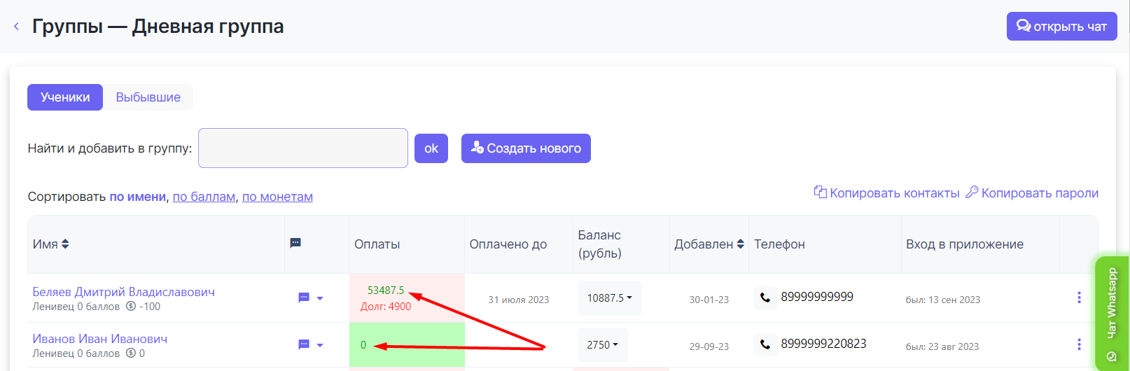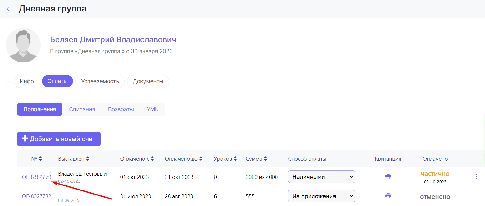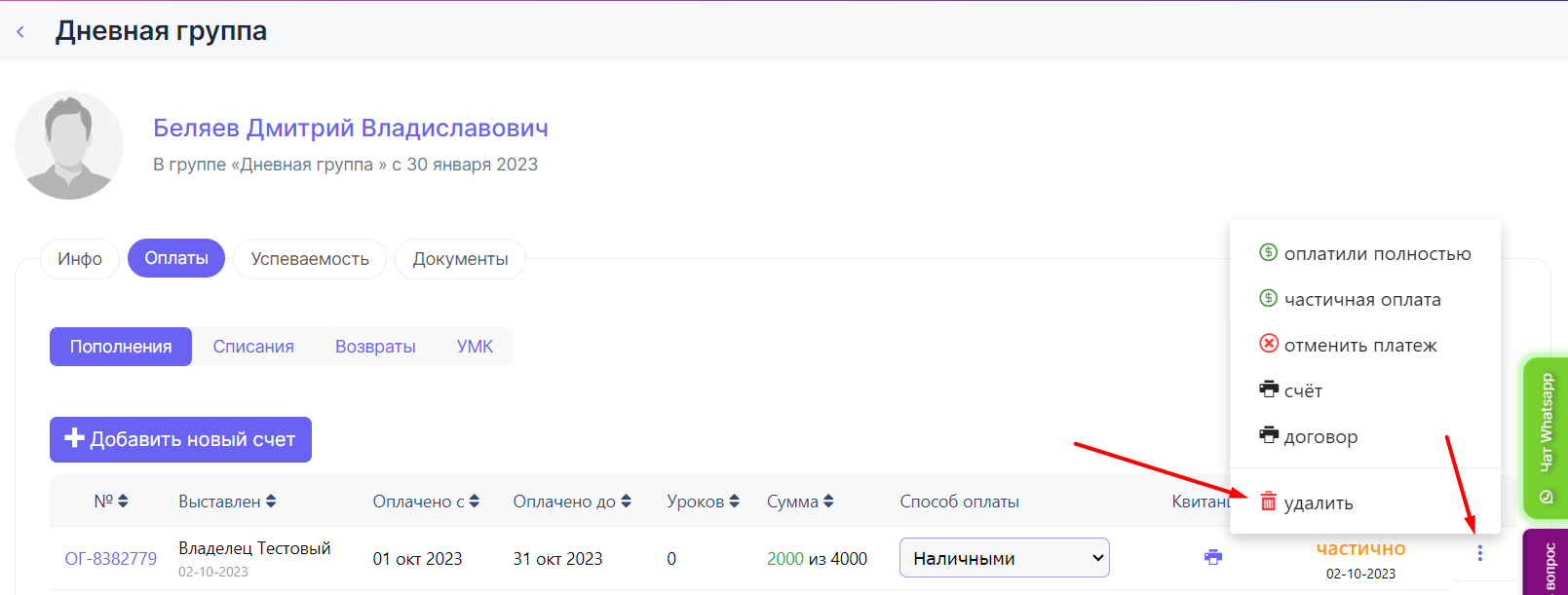 Чтобы удалить счет, как оплаченный, так и неоплаченный, зайдите в нужную группу и нажмите на столбец "Оплаты" напротив нужного студента.