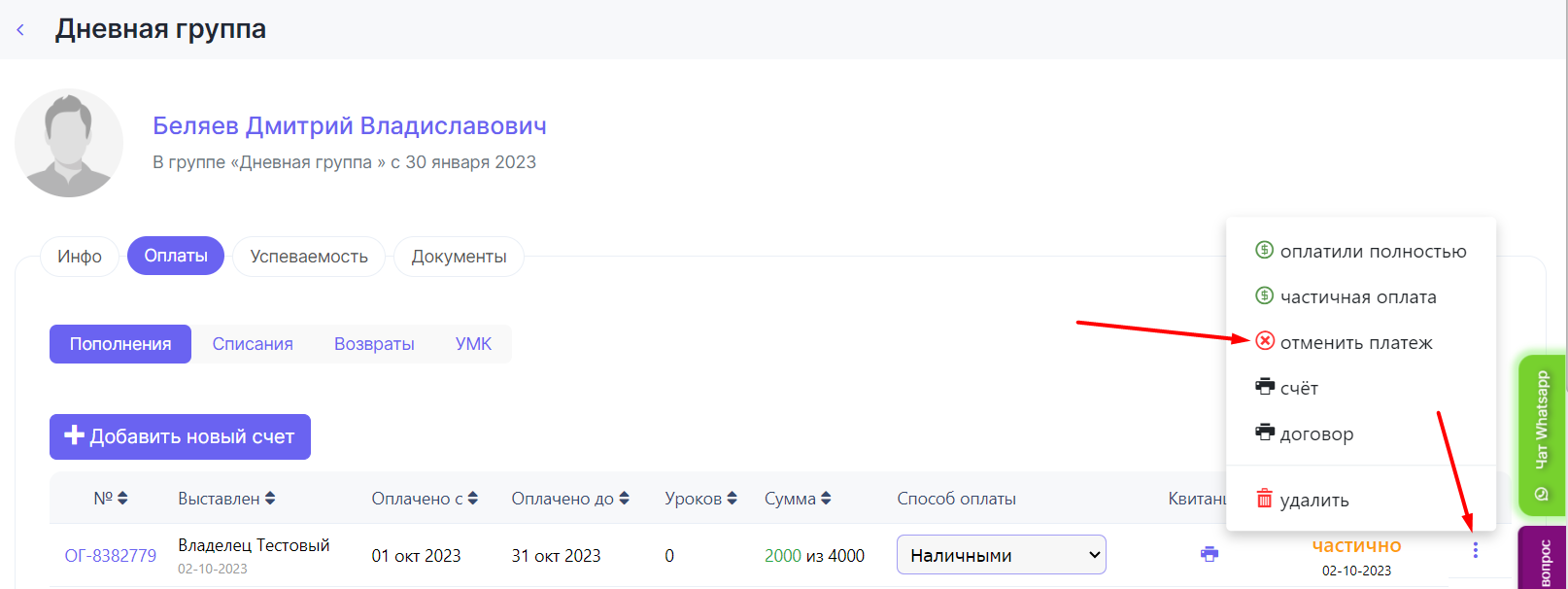 Чтобы отменить внесенную оплату по счету, не удаляя его, нажмите на три точки напротив счета и выберите "отменить платеж".