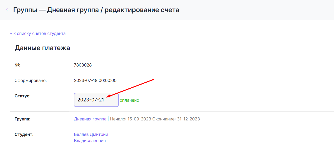 Чтобы изменить дату оплаты, откройте счет и измените дату в графе "Статус". Обратите внимание, что дату оплаты можно изменить только у уже оплаченного счета.